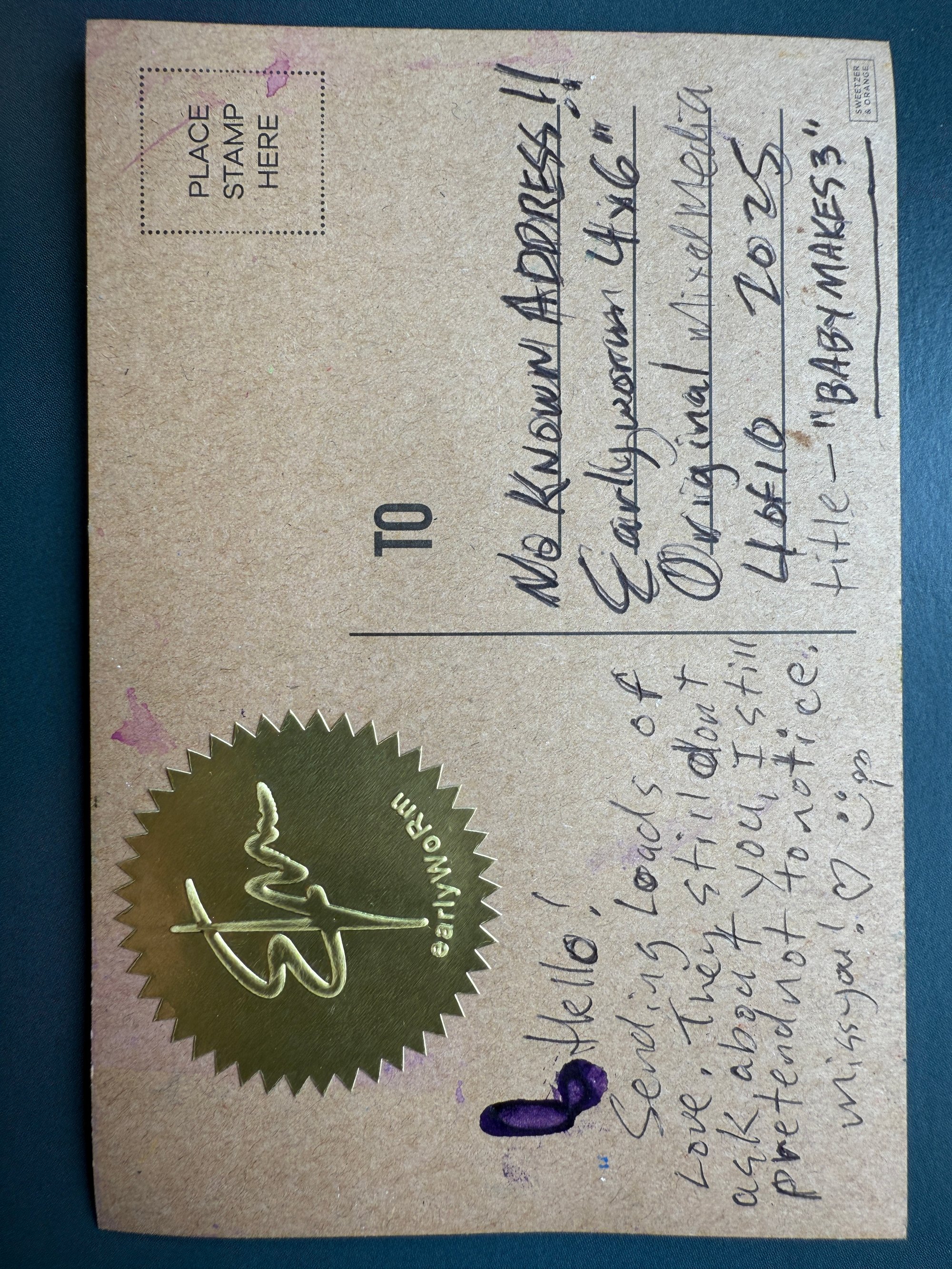 The reverse side includes a handwritten note, sealed with earlyWoRm's gold stamp adding a layer of story, mystery and presence to each work.