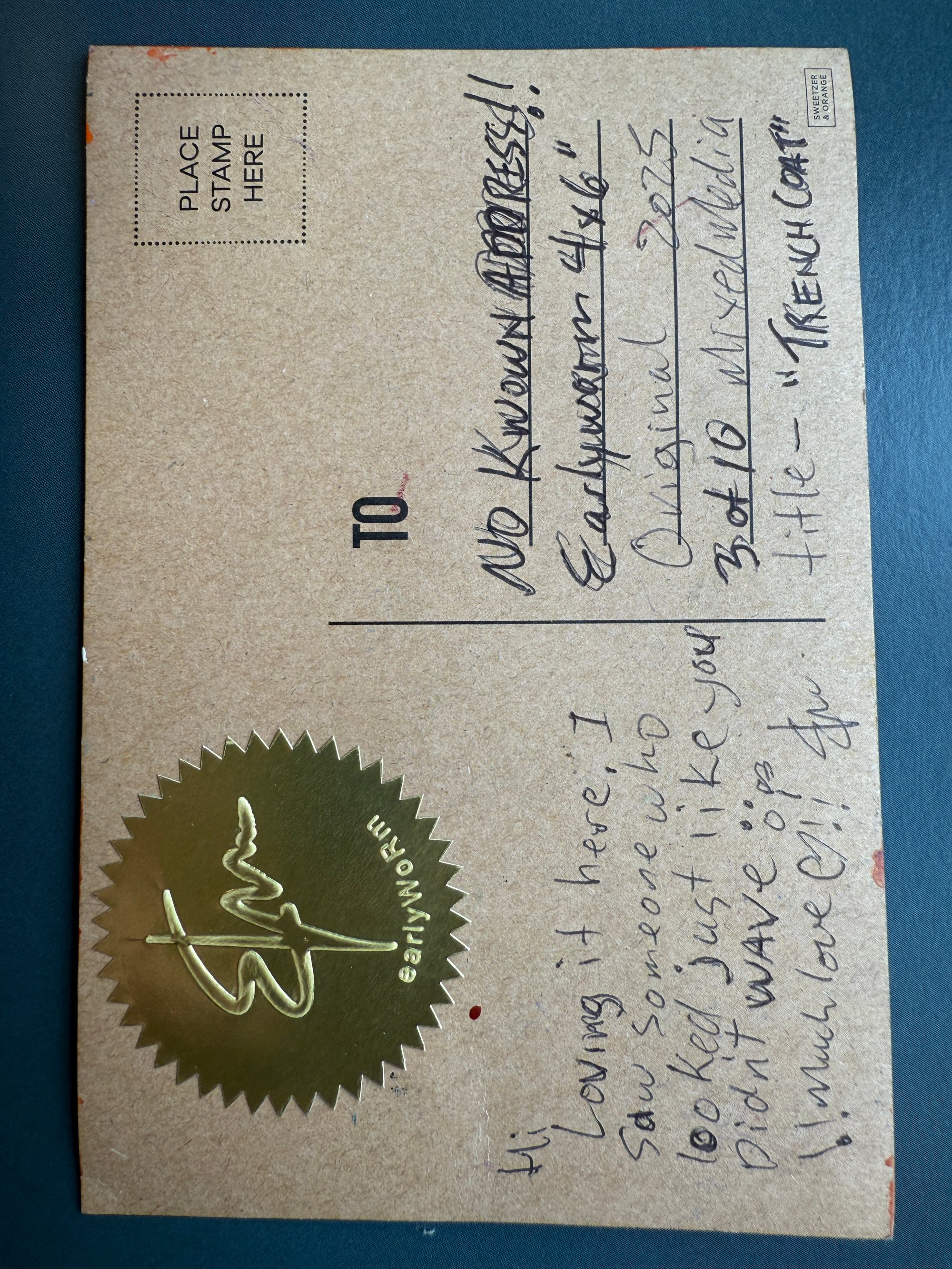 The reverse side includes a handwritten note, sealed with earlyWoRm's gold stamp adding a layer of story, mystery and presence to each work.