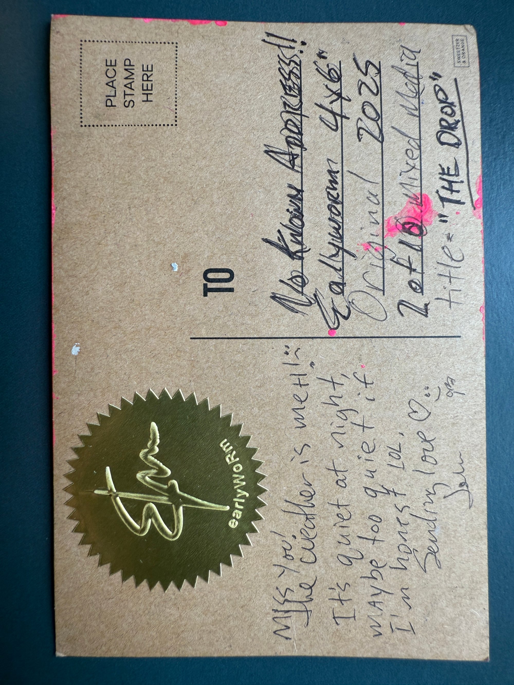 The reverse side includes a handwritten note, sealed with earlyWoRm's gold stamp adding a layer of story, mystery and presence to each work.